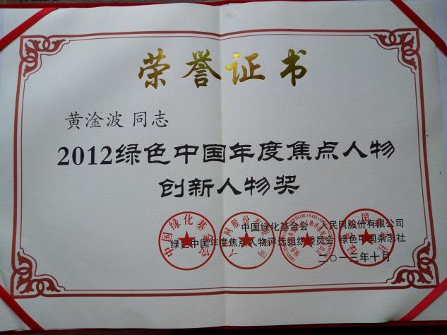 2013年10月,黄淦波获得中国绿化基金会、人民网、绿色中国年度焦点人物评选组委会、绿色中国杂志社联合颁发的“2012绿色中国年度焦点人物创新人物奖”。