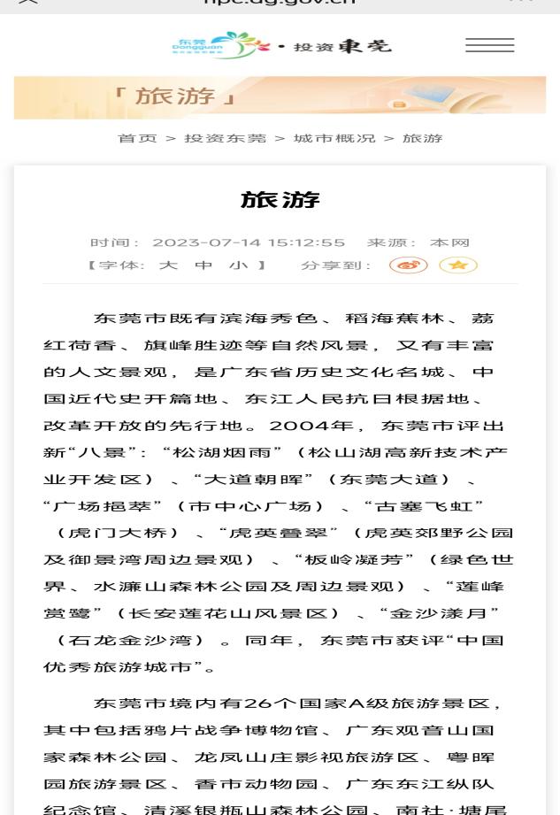 那么,东莞市政府是怎样对待观音山公园的呢?笔者打开东莞市人民政府网站,在> 投资东莞 > 城市概况 > 旅游里介绍了“东莞市境内有26个国家A级旅游景区,其中包括鸦片战争博物馆、广东观音山国家森林公园……”