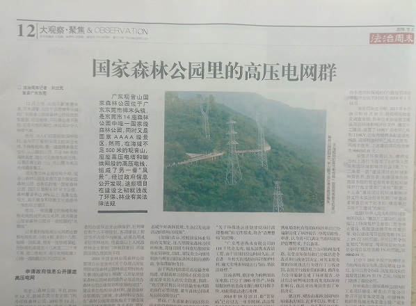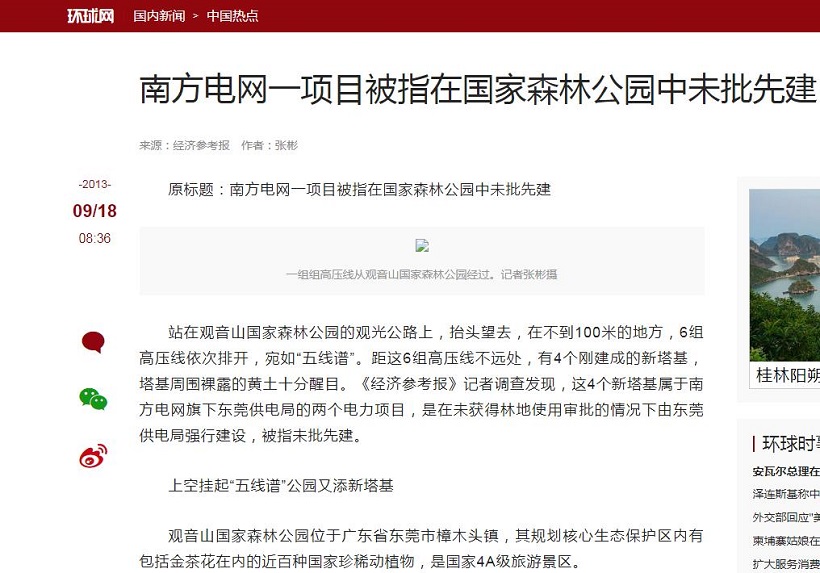 中国电力网转载的人民网文章《人民直击丨广东观音山:违建、缺电背后的森林公园争夺战》