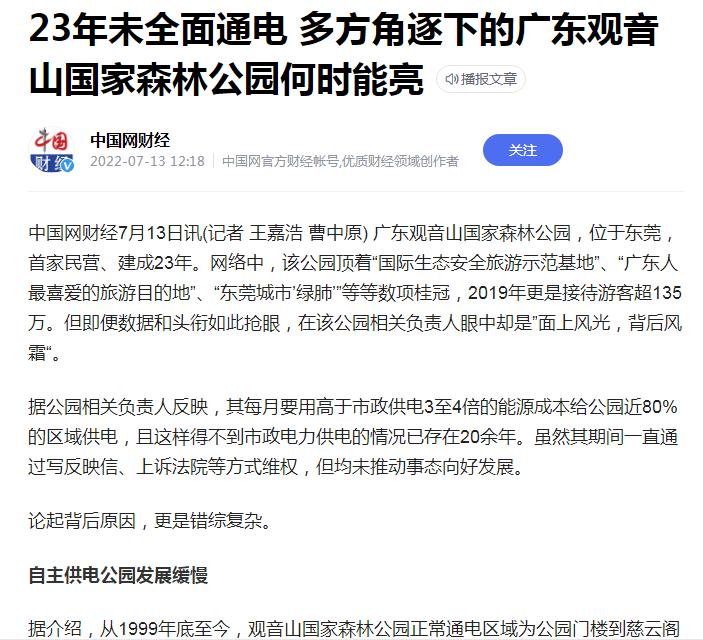 人民网在2022年8月发布的《“自主发电二十余年”,谁带观音山国家森林公园“渡劫”?》