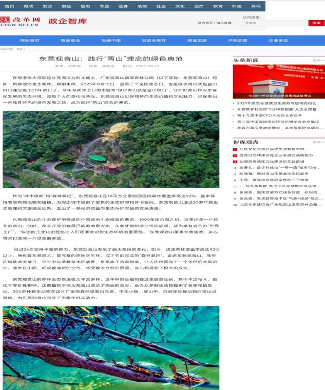 2025年8月15日,是第三个全国生态日,也是绿水青山就是金山银山理念提出20年的日子,中国改革报刊发了《东莞观音山:践行“两山”理念的绿色典范》指出:东莞观音山的生态保护历程堪称中国城市生态修复的典范。从曾经无人问津的荒山,到如今年接待游客超120万人次的国家4A级旅游景区,东莞观音山用26年的时间,生动诠释了“绿水青山就是金山银山”的科学论断。