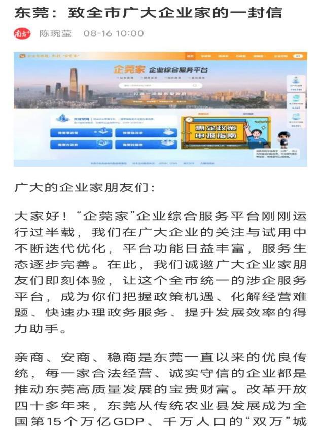 8月16日,东莞市政务服务和数据管理局发出了《东莞:致全市广大企业家的一封信》,信里指出亲商、安商、稳商是东莞一直以来的优良传统,每一家合法经营、诚实守信的企业都是推动东莞高质量发展的宝贵财富。企业是经济发展的支柱,企业家是时代进步的脊梁。东莞的高质量发展离不开每一家企业的奋斗与贡献。当前,东莞牢固树立“整体政府”理念,以企业需求、用户思维为导向,以“企业办事总入口、企业诉求总客服、企业服务总超市”为定位,以“一站享政策、一键提诉求、一网办政务、一窗找服务”为主要功能,搭建的“企莞家”平台真正成为企业的家。“企莞家”平台汇聚了全市所有惠企政策,企业诉求一键反馈、一站响应,你们的任何诉求,我们都将统一受理、分类转派、限时办理和及时回复,一站式解决你们的难题。