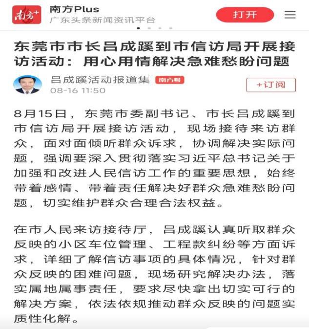 8月16日,南方+再次发布《东莞市市长吕成蹊到市信访局开展接访活动:用心用情解决急难愁盼问题》:在市人民来访接待厅,吕成蹊认真听取群众反映的小区车位管理、工程款纠纷等方面诉求,详细了解信访事项的具体情况,针对群众反映的困难问题,现场研究解决办法,落实属地属事责任,要求尽快拿出切实可行的解决方案,依法依规推动群众反映的问题实质性化解。