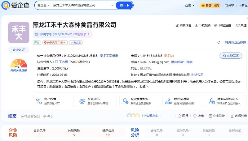 企查查显示禾丰大森林食品公司成立于2023年6月,法人丁志勇。关联风险有74条,经营范围包括许可项目:家禽屠宰;食品销售;食品生产;道路货物运输(不含危险货物)。