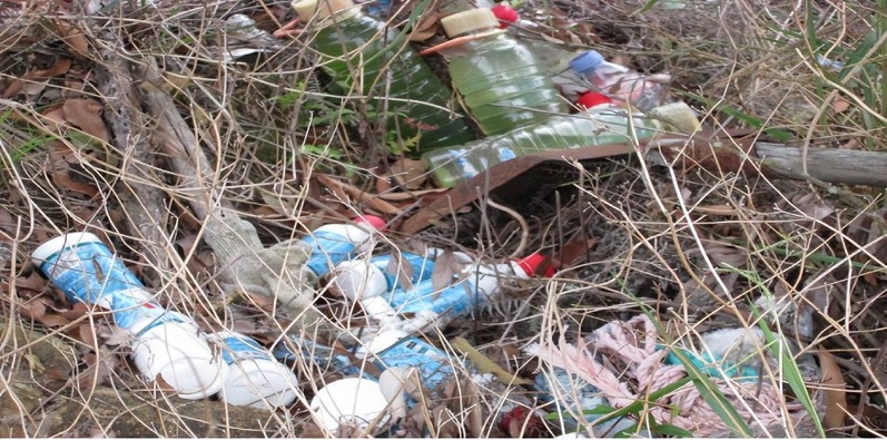 ▲观音山公园内被毁林地上到处散落着喷洒果树的农药瓶子
